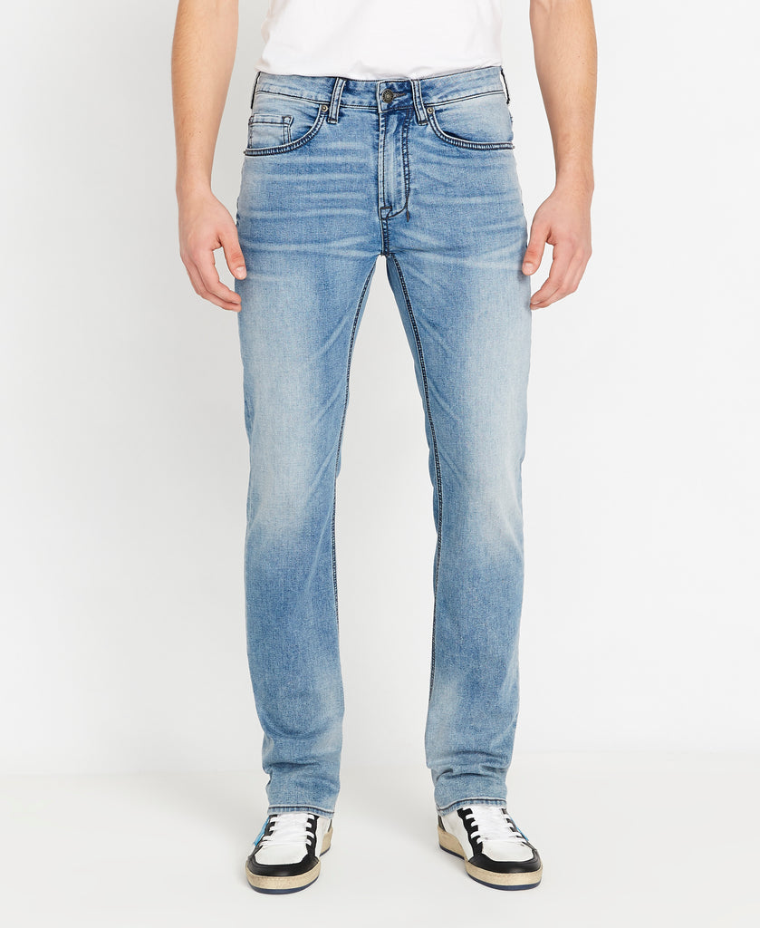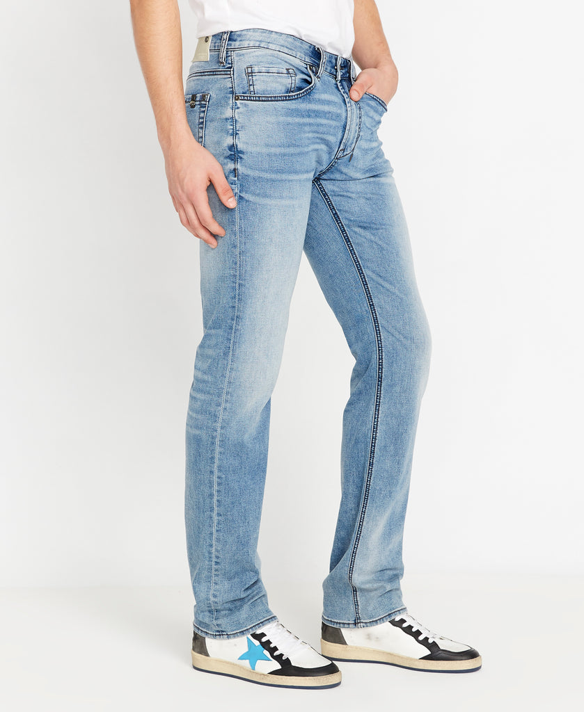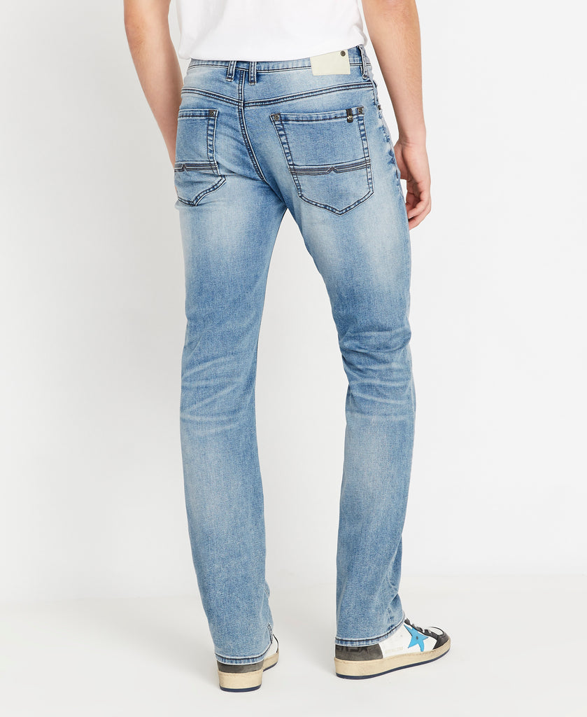 Quality you can count on for everyday comfort. These mid wash jeans are elevated with whiskering, a five pocket design with back pocket embroidery and a straight fit.