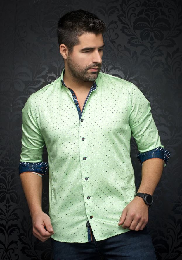 Men's casual dress shirt. Stand out with contrasting patterns and sophisticated details. Comfortable with high-end stretch cotton fabric.