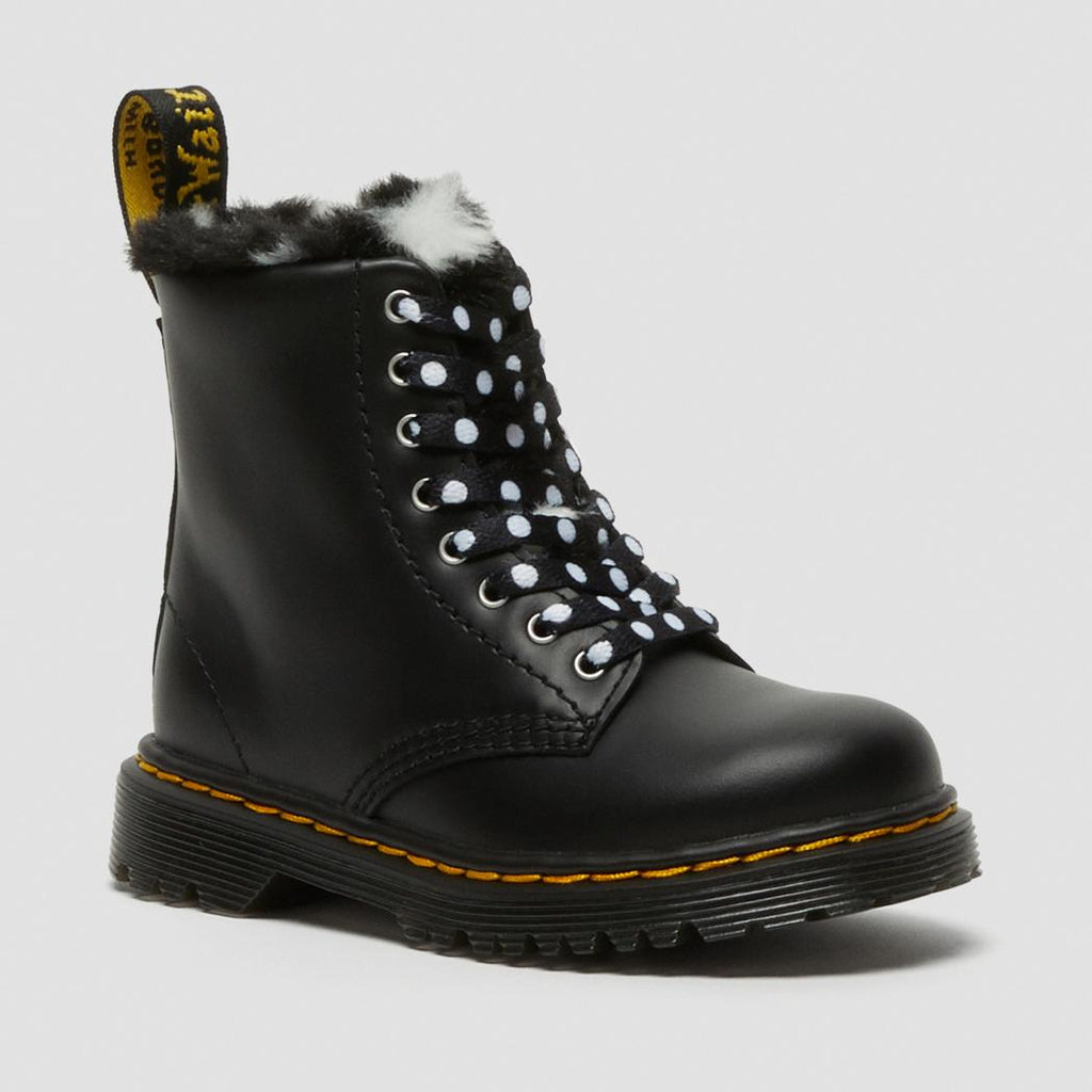 Winter ready and loaded with Docs attitude. Our scaled-down 1460 Serena boot is built to stand out, with polka dot detailing and an added faux-fur lining. Featuring inside zips for easy on/off access and a tough but comfortable Smoke BEN sole, the boots are finished with all our core markings including a black and yellow heel loop and yellow stitching.