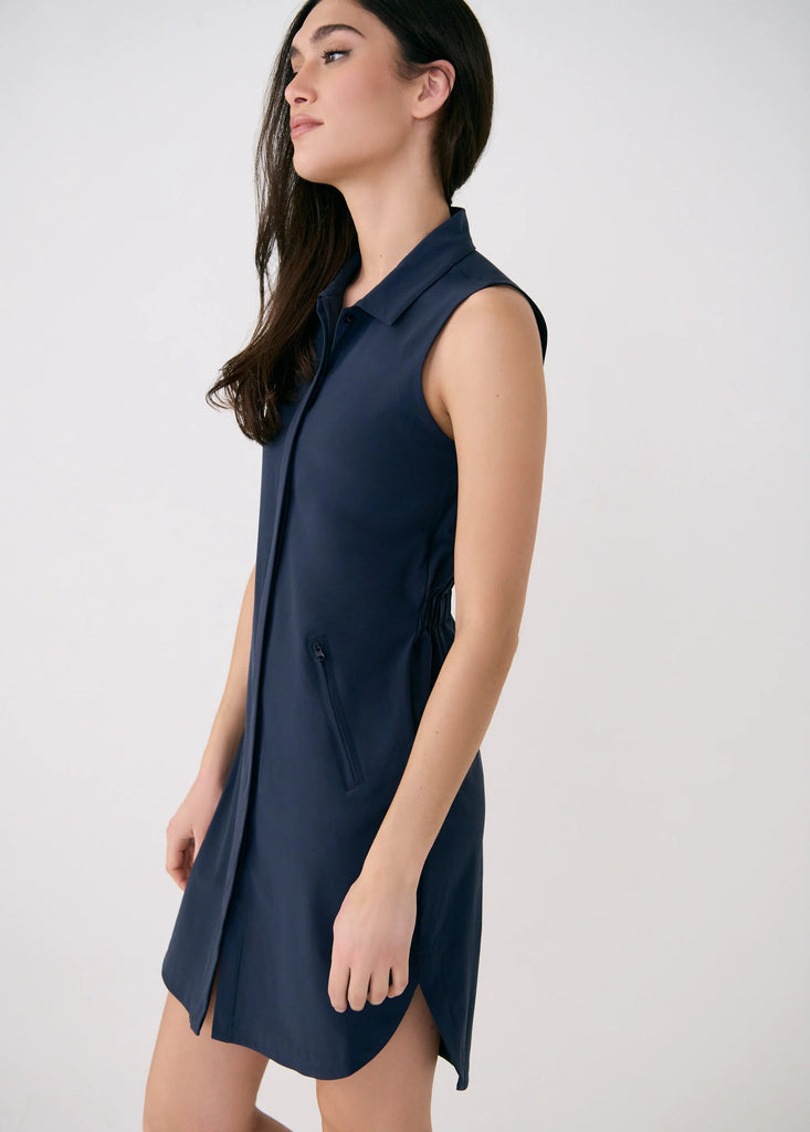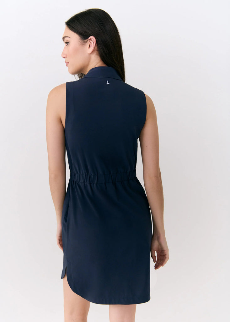 The LOLE Olivie Shirt Dress features a classic fit, designed with a high-low shirttail hem and a back elastic waist for definition.