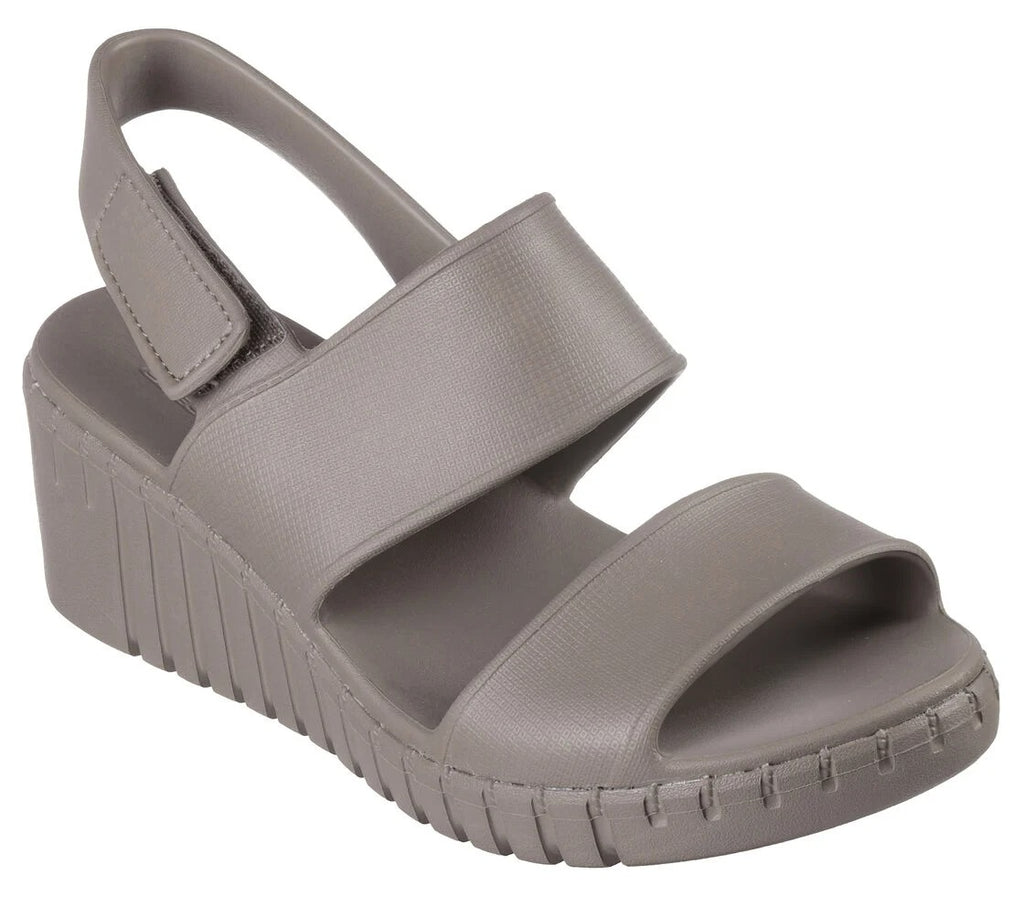 Take time to sparkle in the sun with Skechers Foamies®: Pier Ave - Promenade. This casual sculpted double strap sandal features a flexible EVA upper, adjustable ankle strap closure, contoured Luxe Foam® footbed and a textured finish wedge heel.