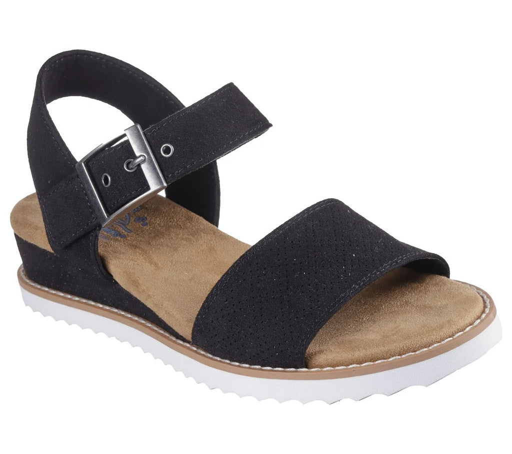 Get warm weather ready wearing BOBS® from Skechers® Desert Kiss - Serendipitous. This vegan fashion wedge sandal features a faux suede upper with perforation details, a metallic-buckled instep strap, perforated midsole trim, plus a cushioned Skechers Memory Foam™ footbed.