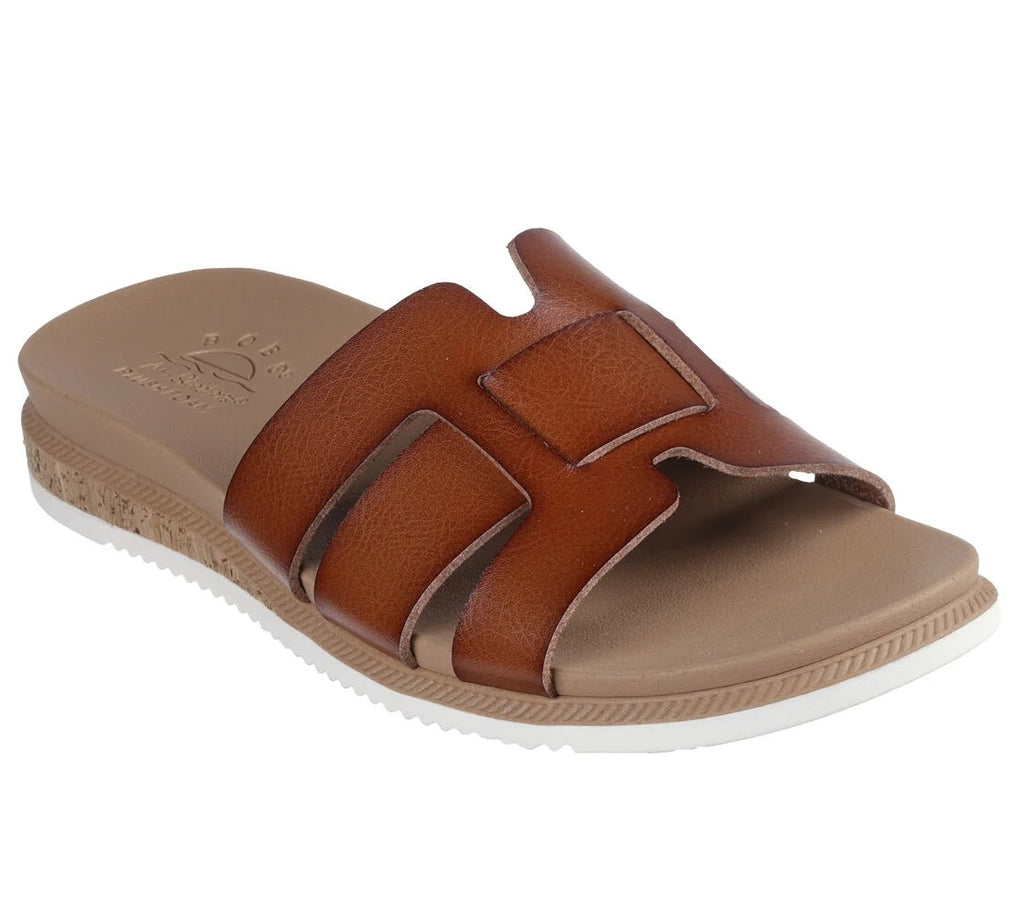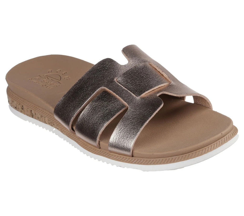 Get warm weather ready wearing BOBS® from Skechers® Desert Kiss - Peak Look. This fashion slide sandal features a vegan leather strap upper, cork veneer midsole trim, plus a cushioned Plush Foam footbed.