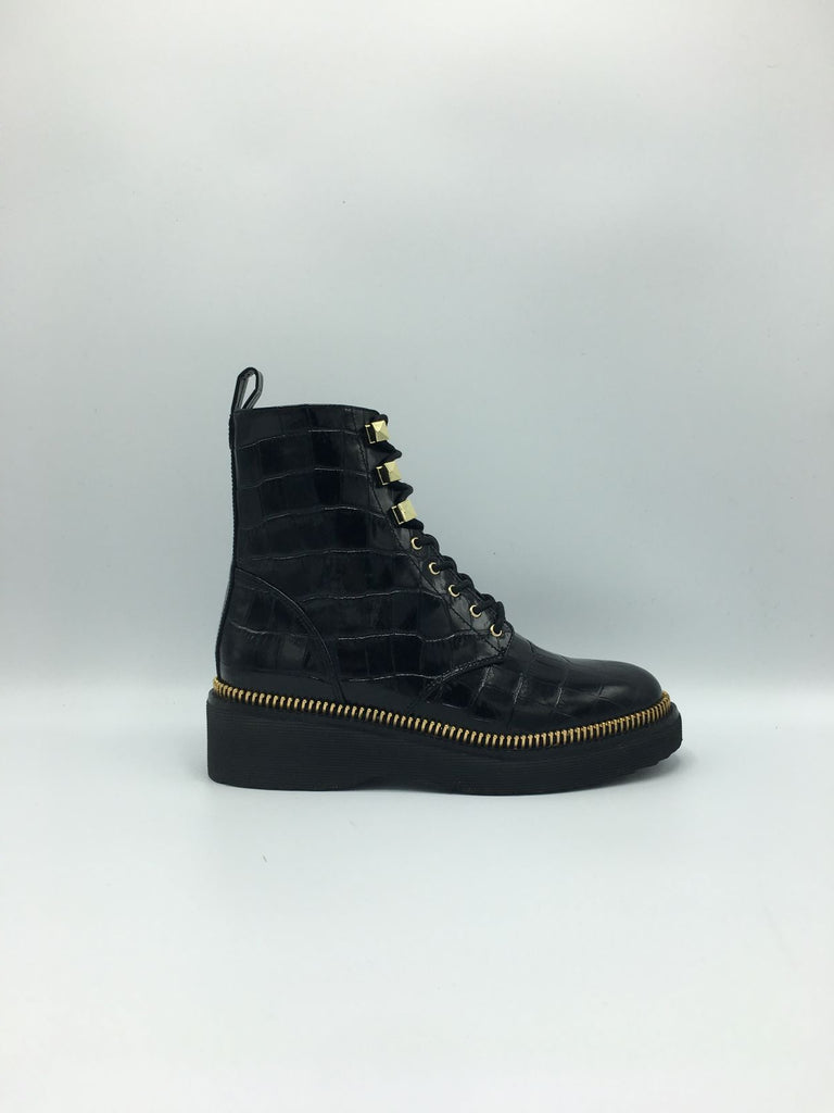 Designed in ultra-chic crocodile-embossed leather, the Haskell is a sophisticated take on classic combat boot styles. Polished pyramid studs punctuate the lace-up vamp, while a side zip fastening renders it easy to wear. Juxtapose their edgy sensibility by wearing them with the season’s printed midi dresses.