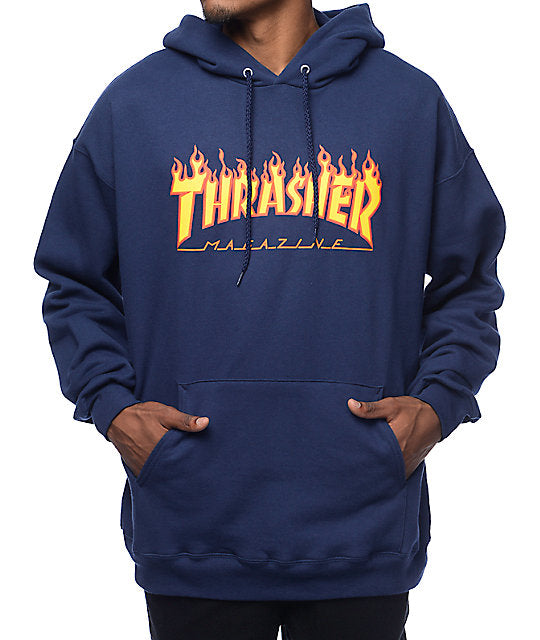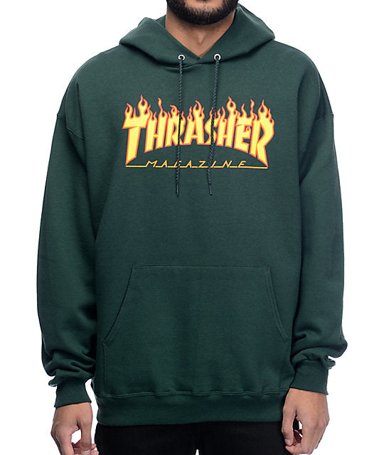 Get a sick skate style with the Flame Logo hoodie from Thrasher. The pullover sweatshirt features a screen printed Trasher Skateboard Magazine text logo on the front with flames and is finished with a fleece lining for comfort.