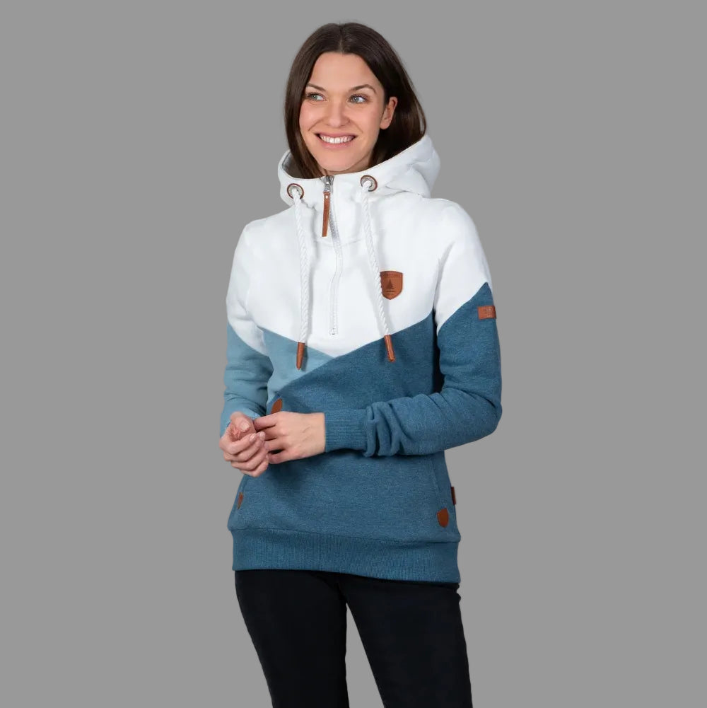 This hoody has low stretch. If your are in between sizes or prefer a cozier fit please size up.