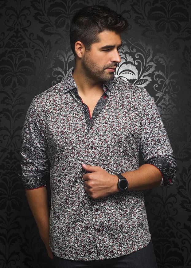 Men's casual dress shirt. Stand out with contrasting patterns and sophisticated details. Comfortable with high-end stretch cotton fabric.