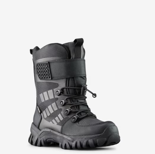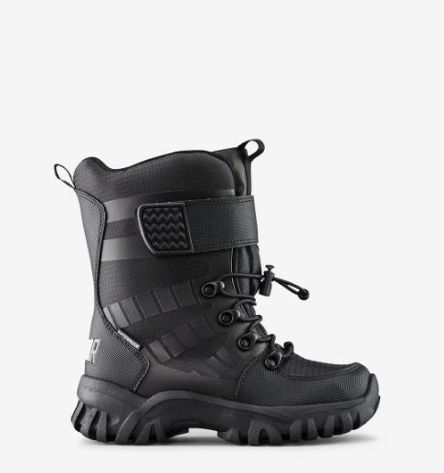 Botte d'hiver en nylon facile à enfiler, avec fermeture auto-agrippante sur le dessus et lacet/bouton décoratif extensible. Languette à soufflet. Semelle intérieure amovible en mousse moulée. Semelle extérieure en caoutchouc thermoplastique.