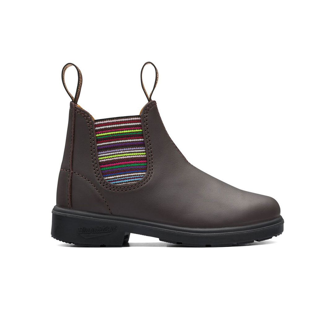 Blundstone 1413 Kids Chelsea in Brown with Striped Elastic is colourful fun and Blundstone comfort for little feet. No-lace freedom gives kids footwear independence. Moms, dads, and teachers, too. Removable insoles for months more wear.