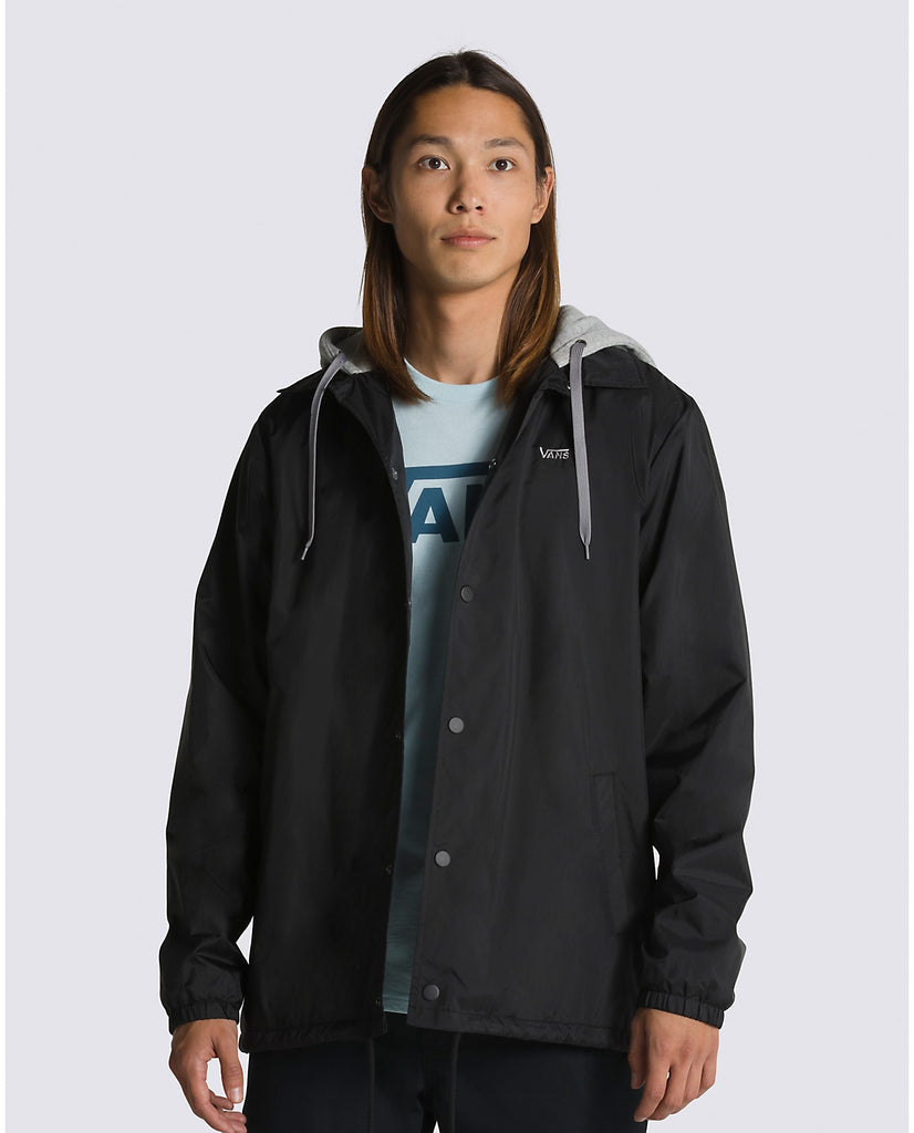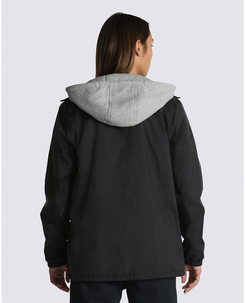 The Riley Coaches Jacket is a 100% nylon water-resistant buttondown coaches jacket with a fully-lined fleece body and hood, logo embroidery at the left chest, and slit pockets at the hips.