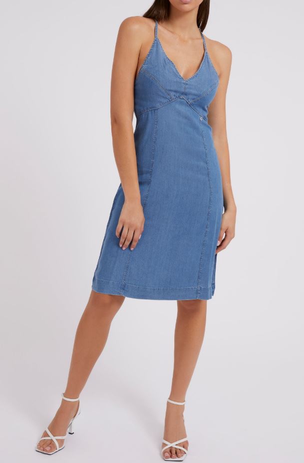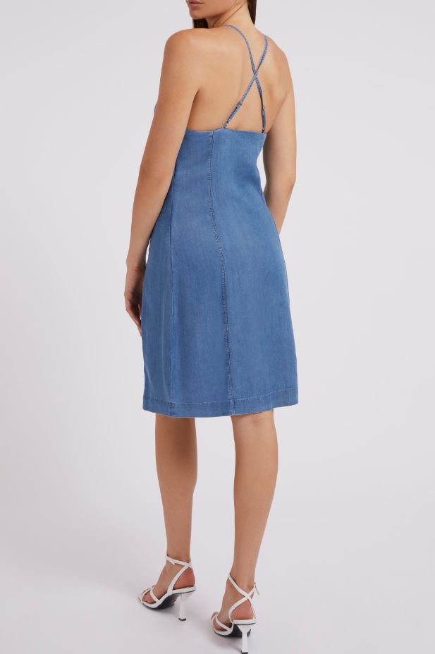 Magnifiquement sculptée pour les journées plus chaudes, cette robe présente une fabrication de couleur indigo, un décolleté en V et de fines bretelles croisées réglables.
