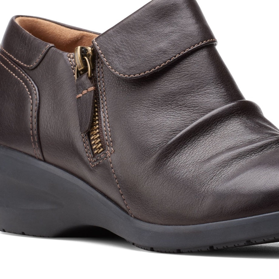 Rosely Lo – Une tige en cuir pleine fleur avec une ligne supérieure pliée et des détails froncés confère à ce modèle une allure unique, tandis qu'une fermeture éclair intérieure discrète facilite l'ajustement. Un talon épais et une semelle extérieure en caoutchouc améliorent sa tenue de marche. Sa semelle intérieure en cuir pleine fleur enveloppe le pied d'un confort moelleux, tandis que la semelle intérieure Contoured Comfort Ortholite® amortit chaque pas.
