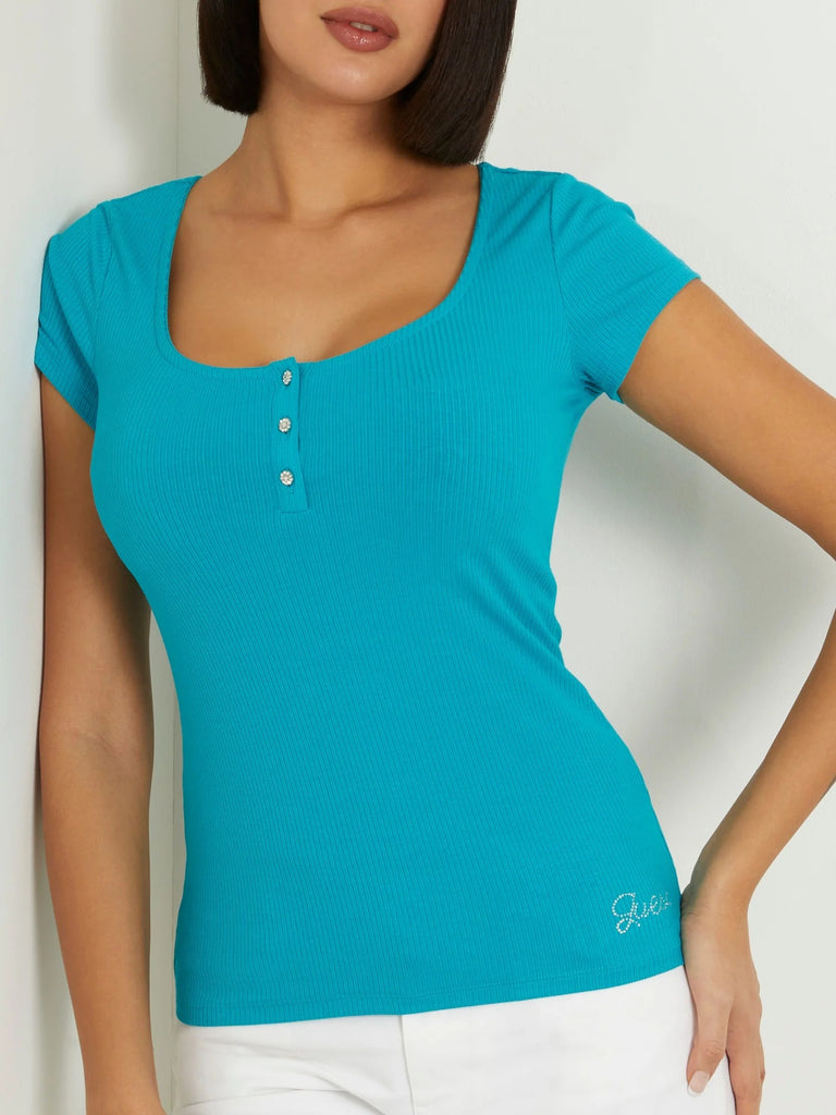 Ce t-shirt Henley côtelé essentiel est glamour grâce à sa fermeture à boutons bijoux. Il est doté de manches courtes, d'une encolure dégagée et est fabriqué à partir de fibres renouvelables à base de bois.