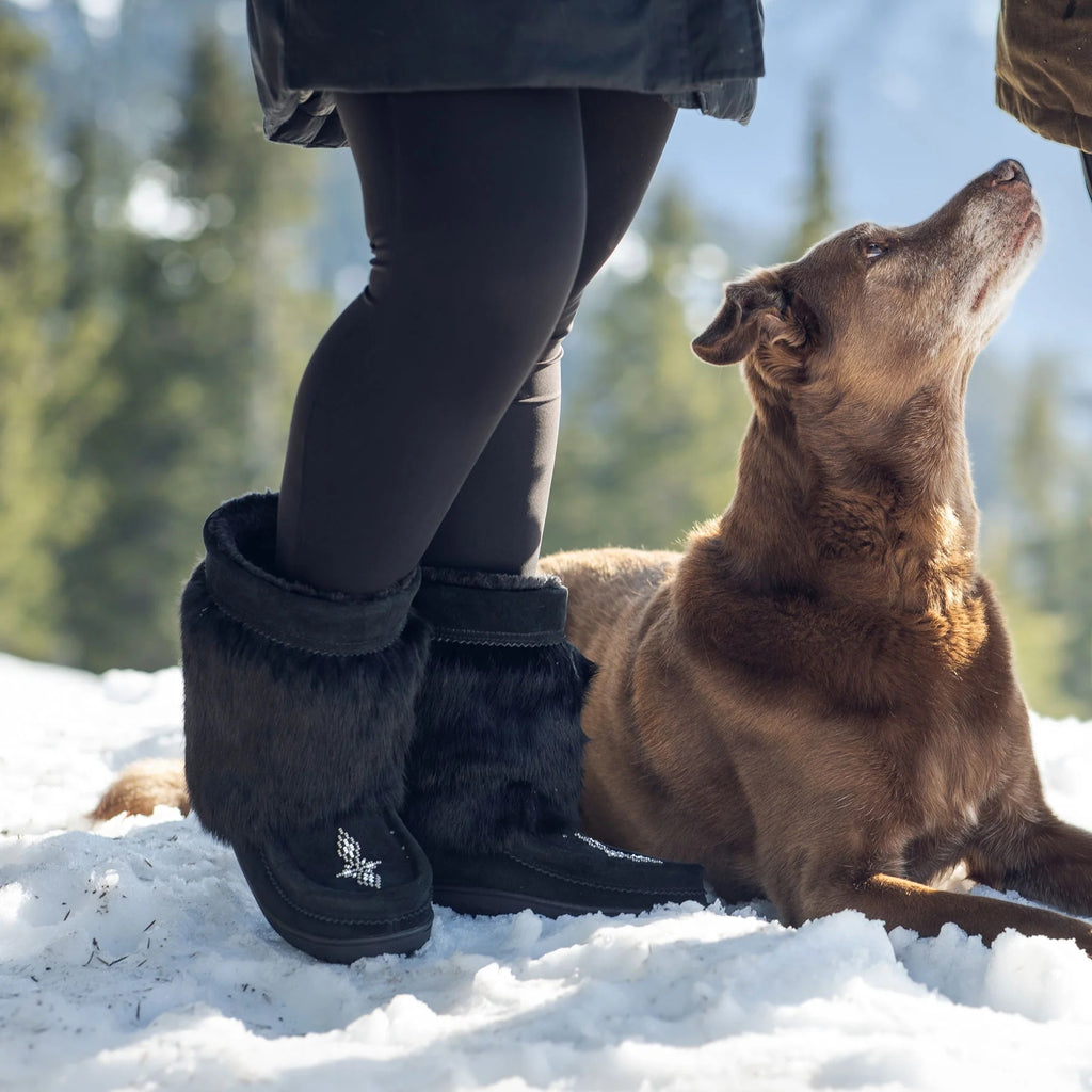 Part of the Solstice collection, the stunning Solstice Half Mukluk shines through winter, never sacrificing grace for practicality. Made of carefully selected cowhide suede trimmed with high-quality rabbit fur, the Solstice Mukluk is based on our iconic Half Mukluk silhouette. With a cozy sheepskin-lined footbed, you'll reach for this beauty — rated to -32C — time after time.