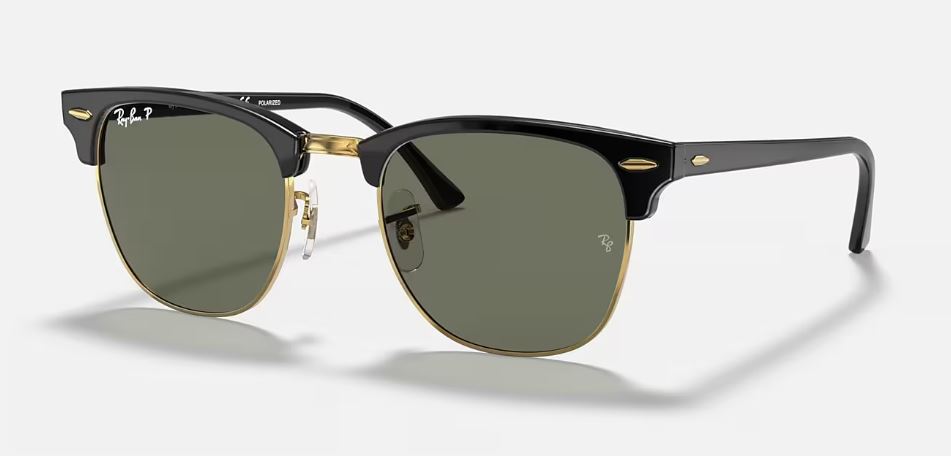 Lunettes de soleil Clubmaster Classic de Ray-Ban. Monture noire polie sur fond doré et verres verts polarisés.