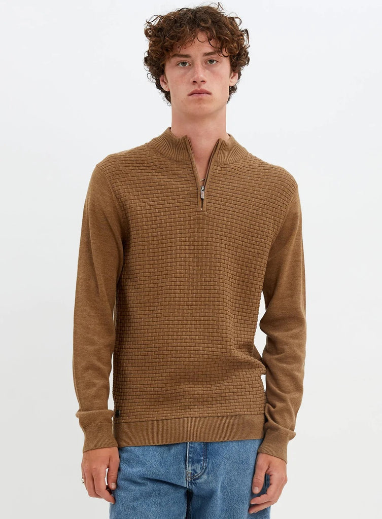 Pull en maille semi-ajusté à col montant zippé, en maille fine, à la texture brique. Un incontournable du quotidien pour l'automne et l'hiver. Peut être porté seul ou superposé à une chemise élégante pour un look plus sophistiqué.