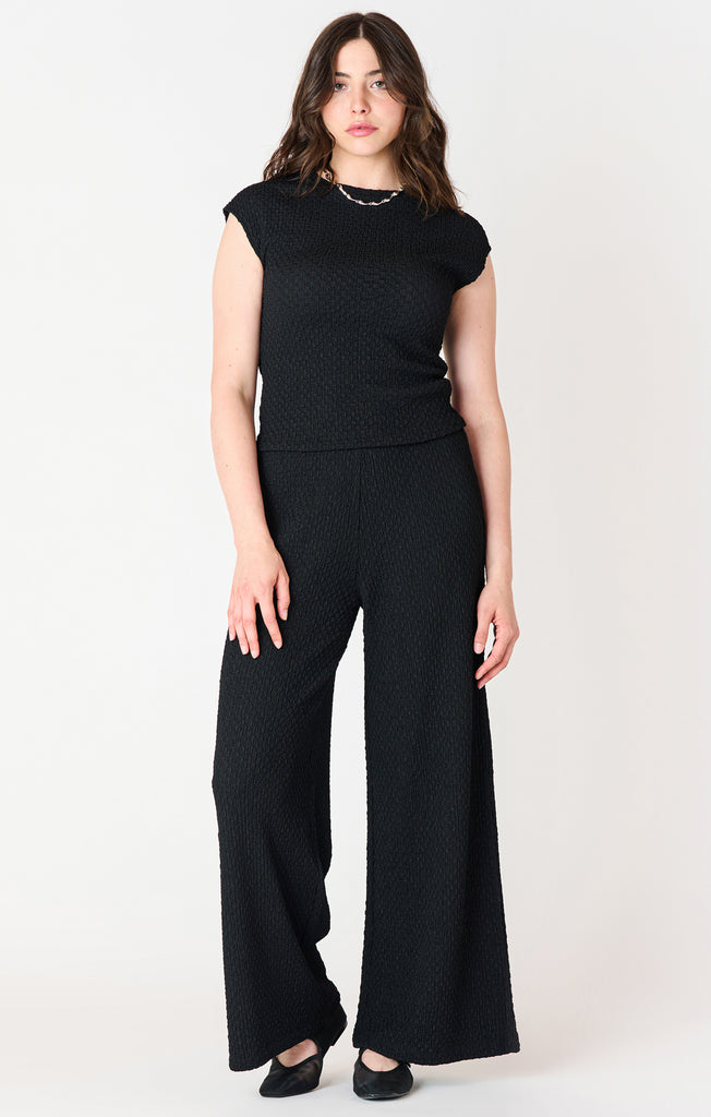 Pantalon large fluide texturé Dex Black Tape. Son tissu texturé apporte une touche d'originalité tout en vous offrant douceur et confort. Avec sa taille haute et sa coupe ample, ce pantalon allonge vos jambes pour une silhouette élégante.