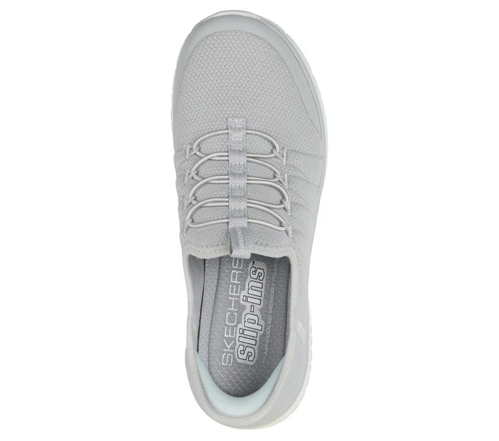 Step into effortless comfort with Skechers Hands Free Slip-ins®: Virtue - Glow. Designed with our Heel Pillow®, this vegan slip-on style features a quarter stitched mesh upper with fixed stretch laces, a Skechers Air-Cooled Memory Foam® insole, and a hands-free molded heel panel.