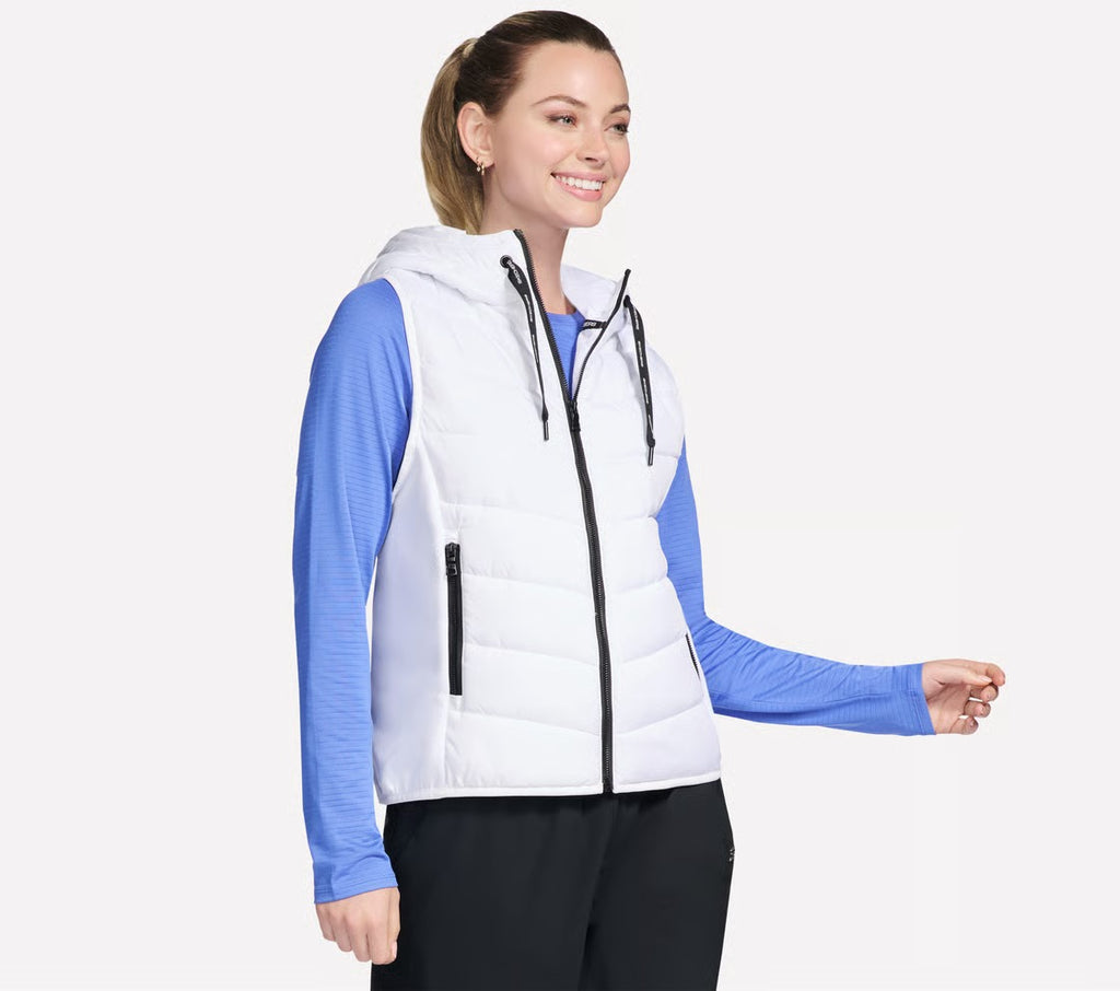 Make a warm and cozy style statement wearing Skechers Performance™ Elite Hooded Vest. This full zip hooded puffer vest is made from our lightweight GO SHIELD™ fabric and features zipped hand pockets and an adjustable branded drawcord at the hood opening.