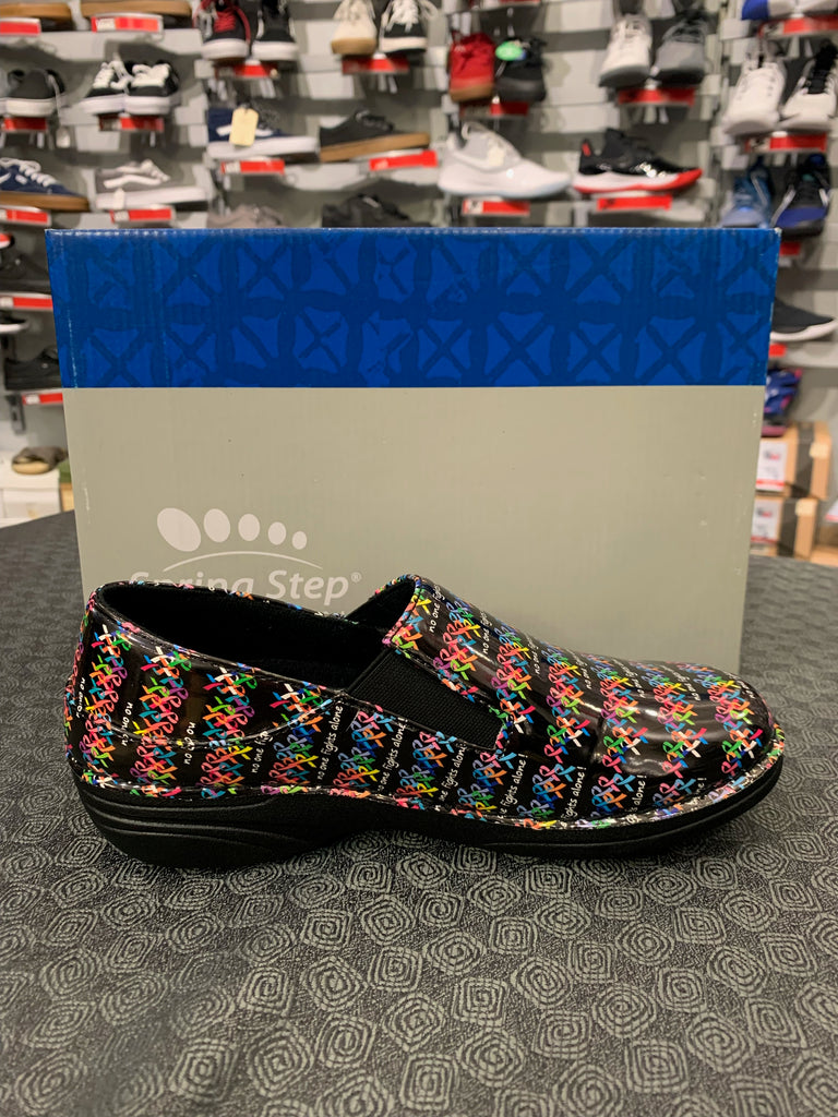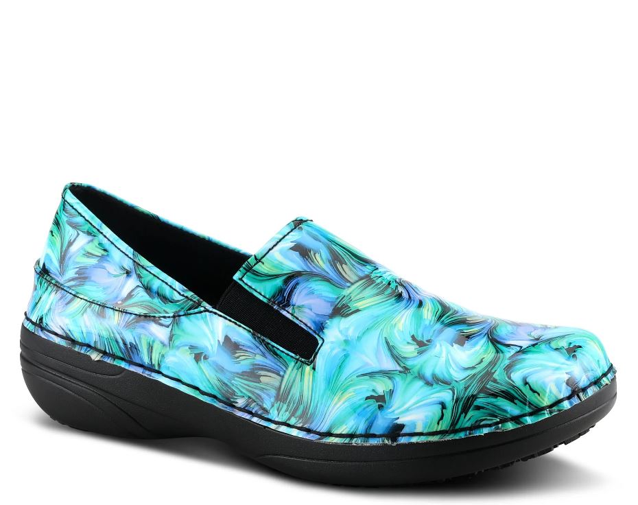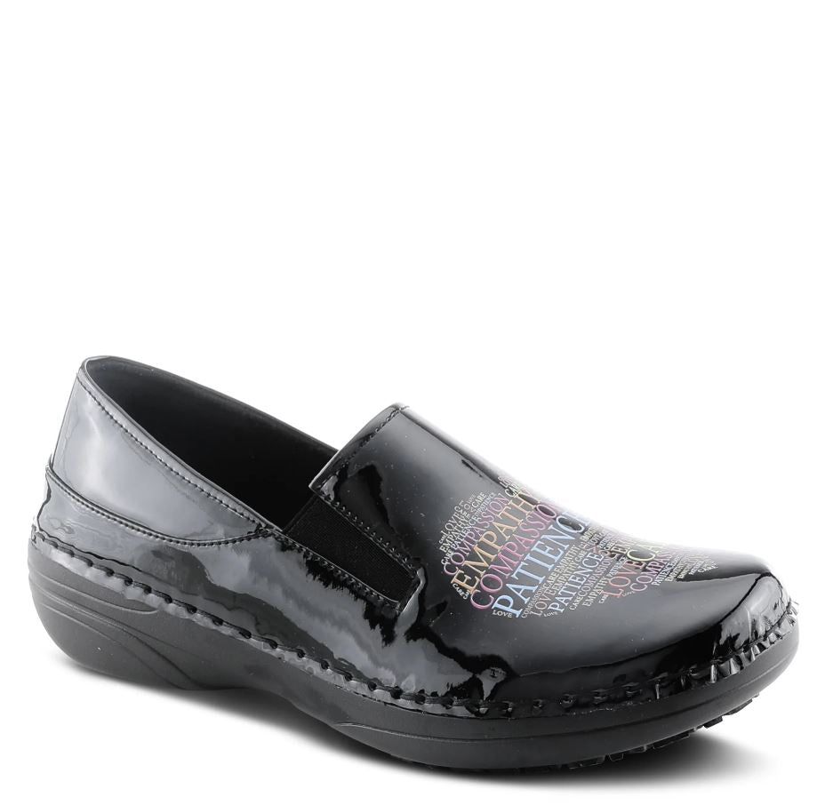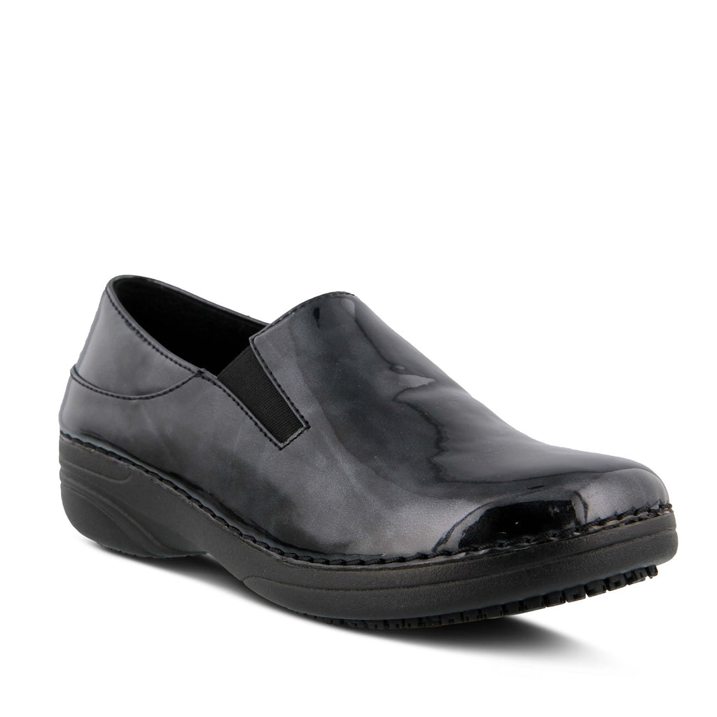 Chaussure à enfiler accrocheuse en cuir verni avec détails élastiques latéraux.