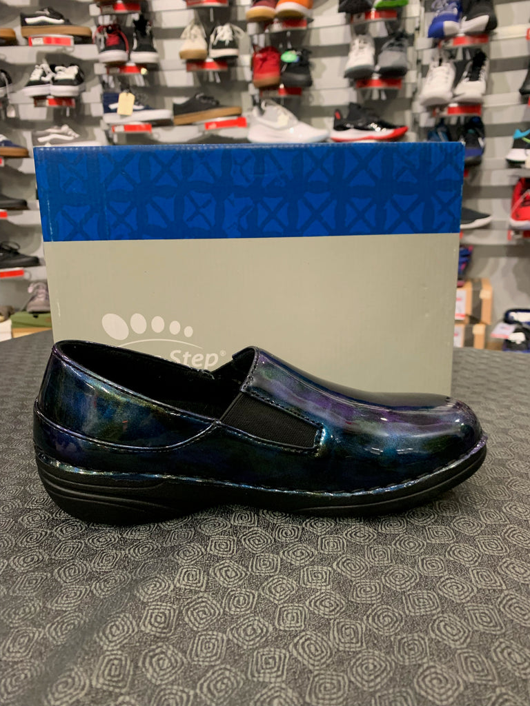 - Bout rond, tige synthétique vernie, élastiques latéraux.