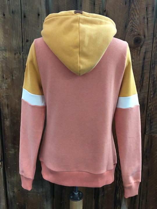 Cowl neck hood with adjustable rope drawstrings and vegan leather caps