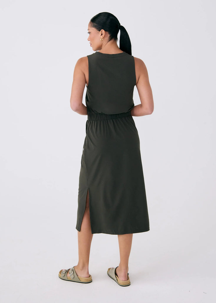 La robe midi LOLE Olivie est rehaussée d'un décolleté cranté, de deux poches, d'une taille élastique pour une silhouette cintrée et de deux fentes latérales.