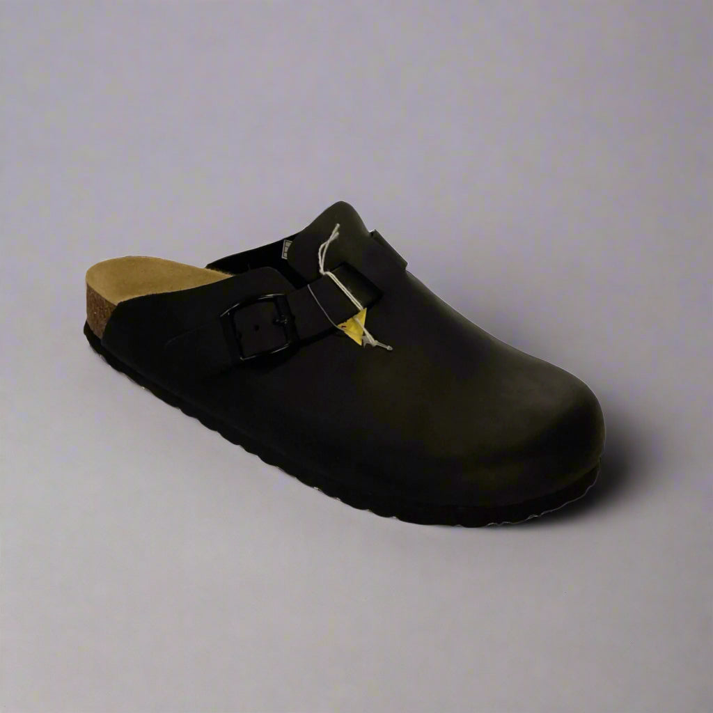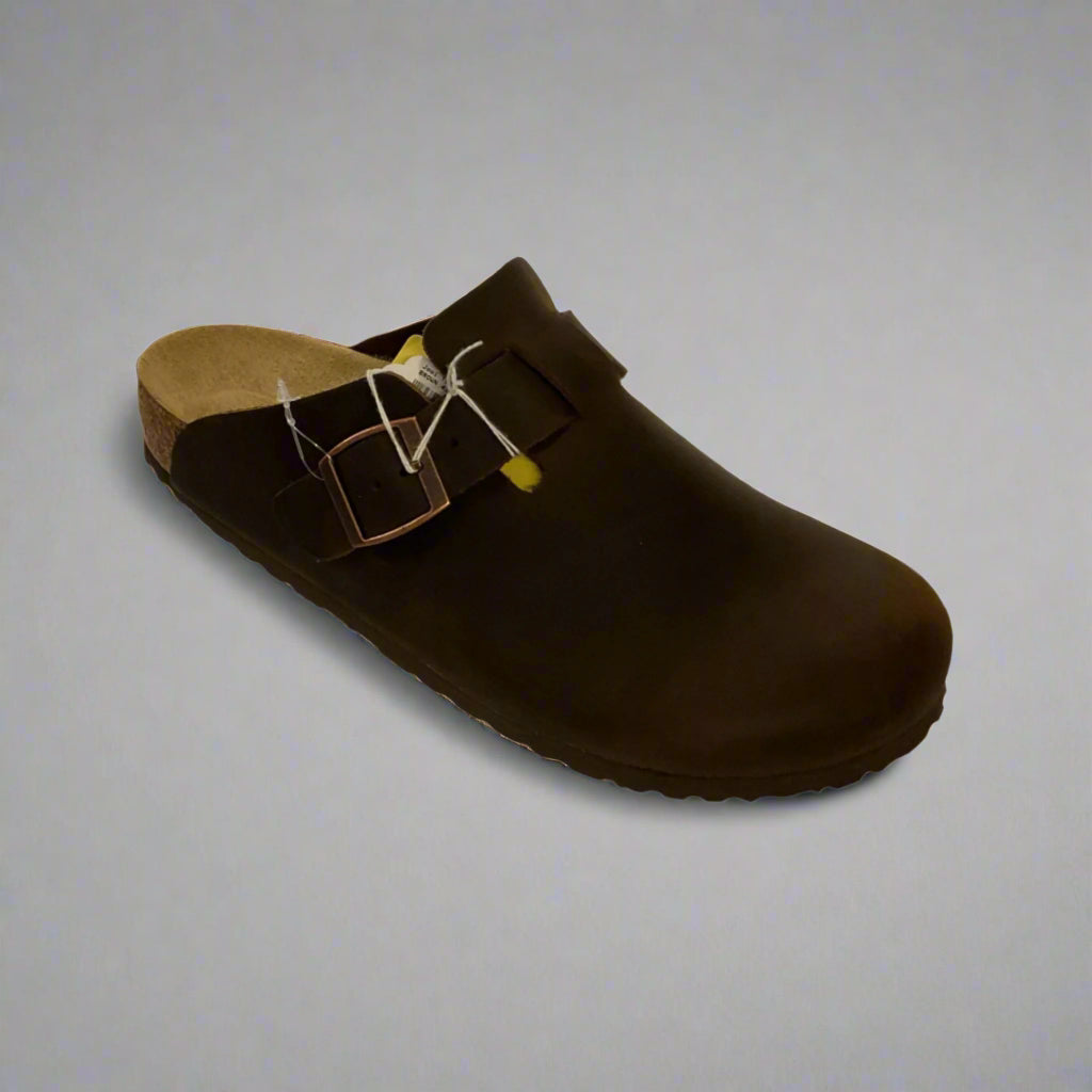 Tyron leather clogs by Jool. Made with an oiled leather upper and a suede, cushioned footbed.