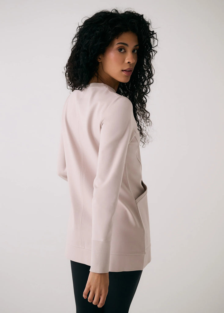 The mindset tunic is a classic fit featuring two front pockets with rib inserts. The 4 way stretch fabrication gives way for easy movement throughout the day and is breathable with a cool to the touch handfeel. Style with leggings.