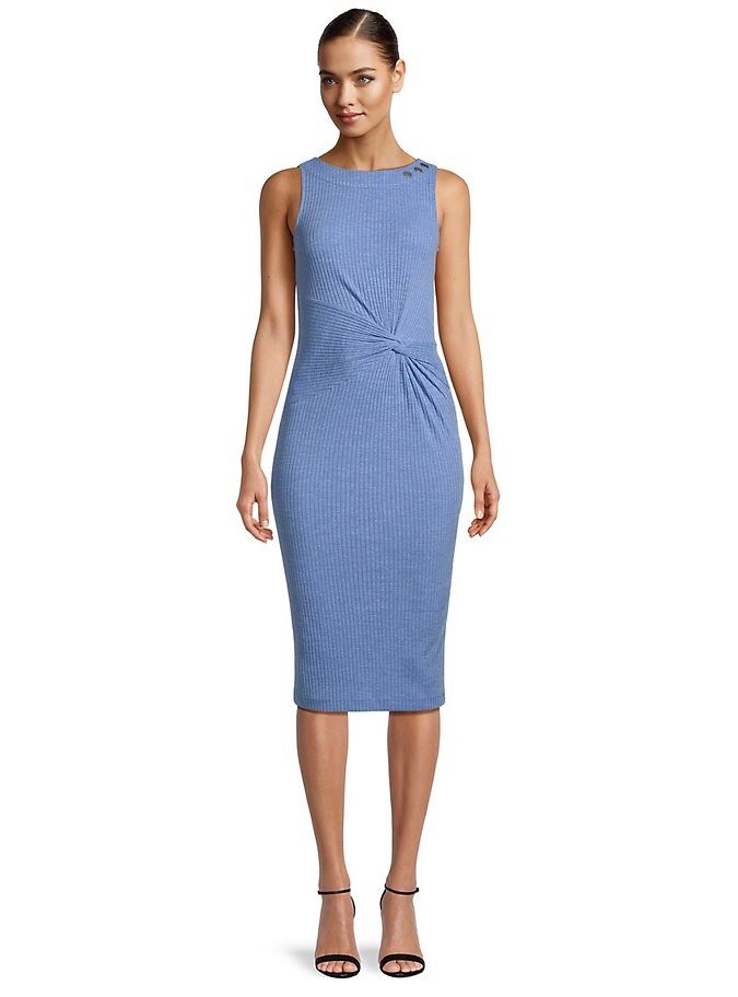 This sleeveless dress features an allover rib pattern with rivets along the neckline and a knotted front detail.